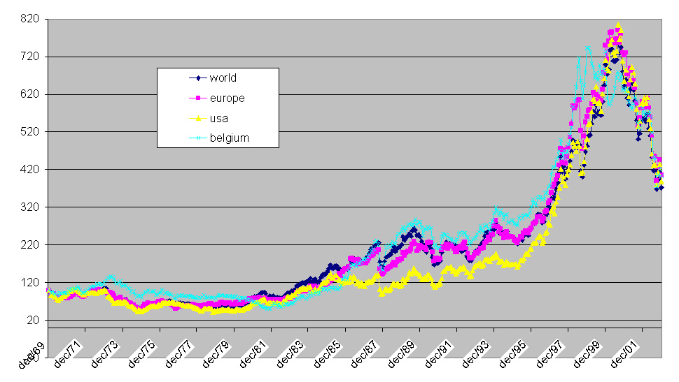 Wie een kort geheugen had kon op het einde van de jaren 90 geloof hechten aan een uitspraak zoals ‘aandelen houden op lange termijn weinig risico in.’ Op de linkergrafiek staat de koersevolutie weergegeven van de internationale aandelenindexen (respectievelijk voor een wereldwijd gespreide portefeuille, de Amerikaanse, de Europese en de Belgische aandelenmarkt) sinds 1970 (Bron: Datastream). De verschillende indexen vertonen een gelijkmatig opgaand verloop tot 2000, hetgeen een beperkt risico suggereert. Op de grafiek is enkel de periode 2000-2003 duidelijk gekenmerkt door neergang, cumulatief tussen 40% en 60%, afhankelijk van het type index. De beurscrash die iedereen kent van naam, oktober 1987 met een daling van 22% in de tijdspanne van 1 maand, is nauwelijks merkbaar. Wie derhalve in 1999 in de beurs gestapt is, individueel of collectief, heeft aanzienlijke verliezen geleden. Voor zover de belegger zijn aandelen niet verkocht heeft, is het verlies weliswaar er een op papier, maar het blijft de vraag hoe lang het zal duren vooraleer de koersen zich zullen hebben hersteld.