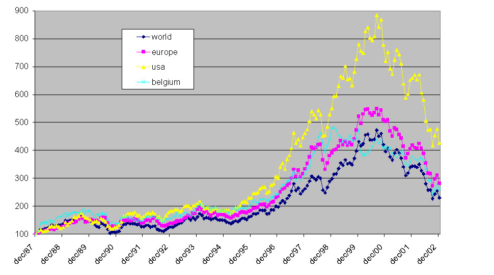 Maar laat ons even de analyse maken over de lange termijn. Iemand die op 1 januari 1970 de portefeuille met Amerikaanse aandelen (cijfers zijn zeer gelijkaardig voor Europa) aankocht en die aanhield (buy-and-hold) haalde op 31 december 2002 een koersrendement van iets meer dan 300%. Dit vertaalt zich in een gemiddeld rendement van 4,3% per jaar. Op 31 december 1999 was dat nog een gemiddelde van 7,0% per jaar. Dit illustreert meteen de dramatische impact van de koerscorrecties sinds 2000. Indien we niet alleen kijken naar de koerswinst maar ook naar de uitgekeerde dividenden, dan zijn de rendementen op jaarbasis over de twee beschouwde periodes respectievelijk 8,2% en 10,7%. Dit voorbeeld illustreert zeer goed het risico van aandelen. Op zeer korte tijd kan een aantrekkelijk uitziende langetermijnbelegging veel van haar charme verliezen. Dat is nog beter te zien op de rechtergrafiek, en zeker voor het geval van de Amerikaanse aandelenmarkt die onder invloed van de internetgekte op het einde van de jaren 90 sneller gestegen was dan de andere geografische indexen. De grafiek toont de evolutie van de beurzen sinds de crash van 1987. In essentie ziet men een onafgebroken stijging tot eind 1999, ondanks tussentijdse accidenten zoals de eerste golfoorlog (1990-91) en internationale financiële crisissen (Zuid-Oost Azië en Rusland 1997-1998). Zeker op de Amerikaanse aandelenmarkt was de stijging, gevoed door het onblusbare vertrouwen in de eigen technologische superioriteit, enorm. Men geloofde dat er een ‘nieuwe economie’ aangebroken was, met het internet als drijvende kracht. De afloop van het verhaal kennen we: de markt keerde terug naar meer realistische niveaus waar voor een gemiddeld aandeel van een Amerikaans bedrijf nu 20 keer de lopende winst wordt betaald in de plaats van 35 keer in tijden van opwaartse speculatie. En ook heden zijn de kampen van de bulls en de bears (beursprofessionals die voorspellen dat de beurs in de nabije toekomst zal stijgen respectievelijk dalen) ongeveer in evenwicht (studie UBS/Gallup).