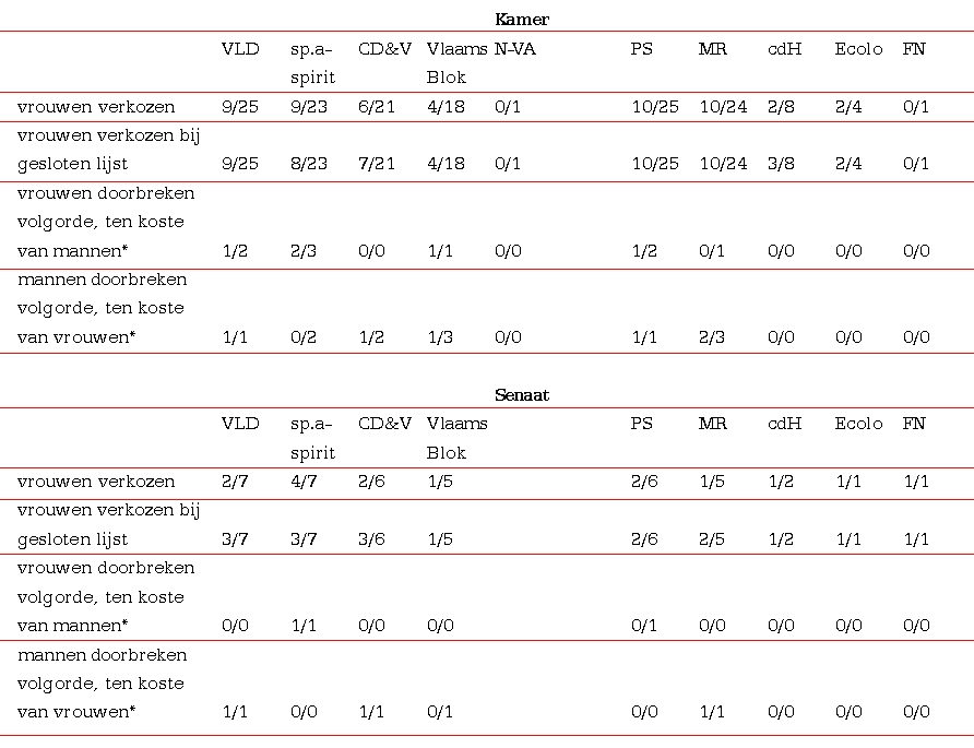 In tegenstelling tot in de Kamer zijn het niet noodzakelijk de partijen met het grootste aantal verkozenen die ook het hoogste aantal vrouwelijke verkozenen tellen. sp.a-spirit is de enige partij waar de winst zich vertaalt naar het aantal vrouwelijke verkozenen en waar van een serieuze toename sprake is. Ook in de Senaat neemt deze partij de fakkel over van Agalev op het vlak van sekse-evenwicht, zij het dat CD&V haar positie hier wel kan handhaven. Een gemakkelijke indicator voor de impact van de gehalveerde lijststem is het aantal vrouwen dat verkozen zou zijn indien de verkiezingen hadden plaats gevonden met gesloten lijsten. Onder die omstandigheden hadden partijen hun kandidaten misschien anders gerangschikt. Maar in het verleden werd de lijstvolgorde zelden doorbroken bij federale verkiezingen gezien het gewicht van de lijststem. Vandaar dat een vergelijking met een situatie waarin de lijsten gesloten waren geweest interessant is. In de Kamer zou één vrouw meer verkozen geweest zijn, waardoor het percentage vrouwelijke verkozenen ook op 35% was uitgekomen. In de Senaat waren 2 vrouwen meer verkozen geweest, waardoor zij met 43% geweest waren. De halvering van de impact van de lijststem heeft dus geen gevolgen gehad voor de vrouwelijke verkozenen van de Kamer, wel voor die van de Senaat. Indien in de Senaat de lijstvolgorde niet was doorbroken waren er trouwens evenveel vrouwen verkozen als op verkiesbare plaatsen stonden.