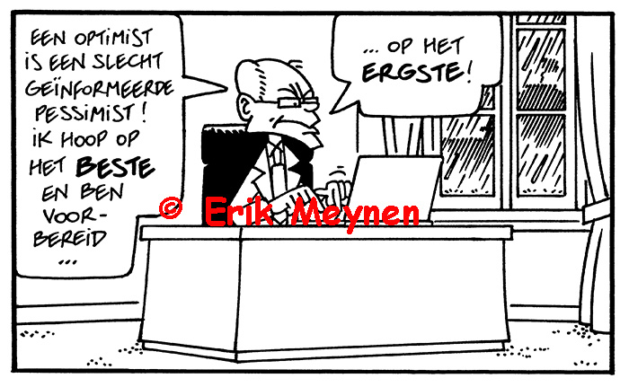 Erik Meynen (Kapellen, 1957) publiceert sinds jaren politieke strips en cartoons, elke dag in Het Laatste Nieuws en elke week in P-magazine, vaak absurd en doldwaas, soms melancholisch en zelfs tragisch, maar altijd raak. Zijn tekeningen werden eerder al verzameld in De Jaren van Dehaene (1999), waarvoor hij de Bronzen Adhemar Stripprijs ontving. Andere titels zijn: De Plannen van Verhofstadt (2003) en Paniek in de Politiek (2006). Hij kreeg onlangs voor zijn werk een eervolle vermelding op de verkiezing van de Press Cartoon Belgium 2009. Binnenkort verschijnt Het Lijden van Leterme, een bundeling strips over de politieke chaos van de voorbije twee jaar. De cartoons in deze portfolio verschenen de voorbije maanden in Het Laatste Nieuws.