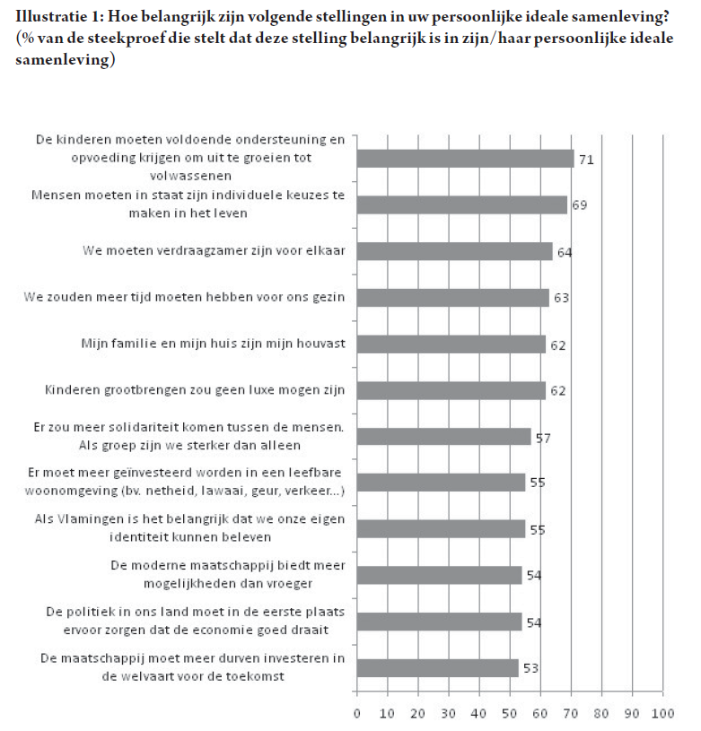 We menen te mogen zeggen dat de oude tegenstelling tussen de ‘haves’ en de ‘have nots’ niet dominant is voor de ideale maatschappelijke verwachtingen. In Vlaanderen vindt men het belangrijk dat de hedendaagse samenleving opvoeding en kinderen ondersteunt, maar vooral dat mensen in staat zijn individuele levenskeuzes te maken (Illustratie 1). Dit heeft voorrang op verwachtingen ten aanzien van de sociale groep. Er is dus nog maar een gering gedifferentieerd klassebewustzijn.