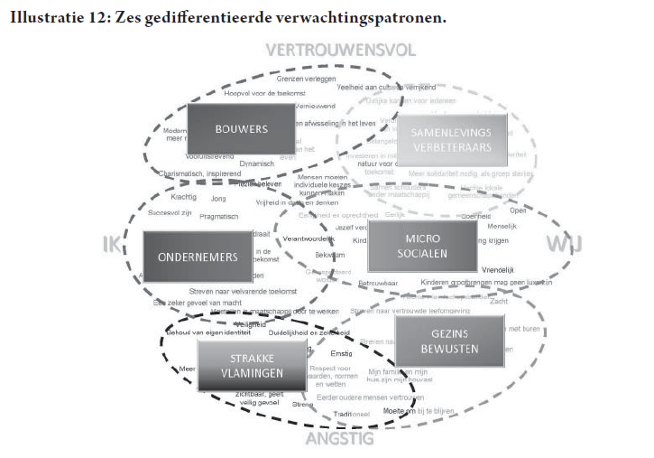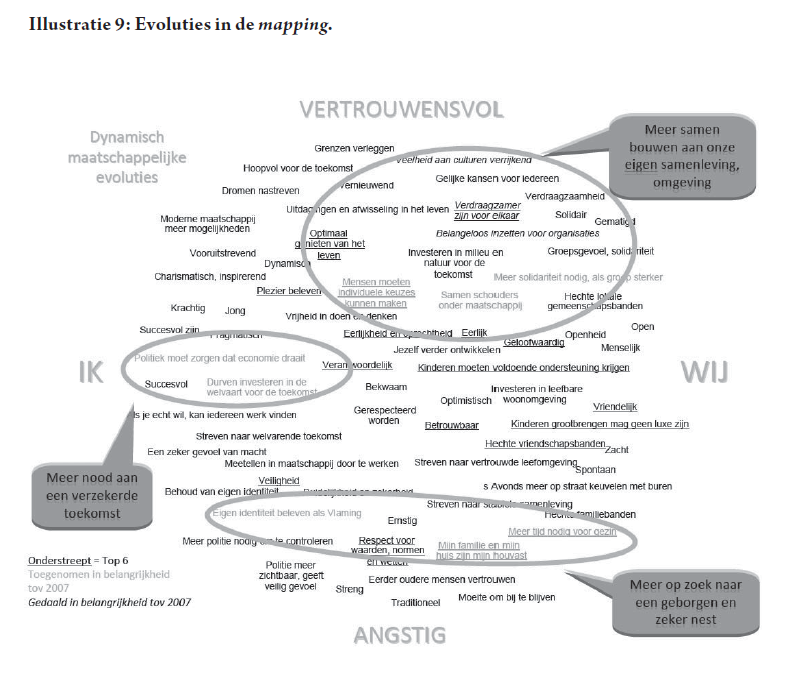In Illustratie 8 herkennen we van onder naar boven de as: vertrouwen versus angst. Dit bevat de tegenstelling: wijds wereldbeeld versus wereldbeeld beperkt tot eigen thuis en gezin. Van links naar rechts gaan we van een egocentrale maatschappij visie (‘ik’ gericht) naar een meer collectieve appreciatie van de samenleving (‘wij’ gericht).