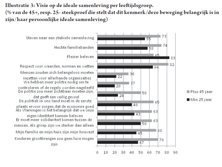 Een ander gegeven is uiteraard de manier waarop men de samenleving bekijkt en leeftijdsgebonden verwachtingen koestert (Illustratie 3). In de zilvergrijze Vlaamse samenleving komen er kloven tussen ouderen en jongeren. Het is bijvoorbeeld duidelijk dat de gezinswaarden veel belangrijker zijn voor ouderen dan voor jongeren. De generation gap is een feit.
