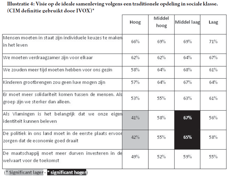- In elk geval zijn er zeer weinig sociale klassenverschillen ten aanzien van de basisidealen ‘kind en gezin’ en ‘solidariteit’ (Illustratie 4).