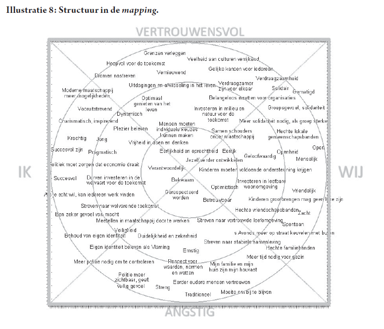 De gebruikte statistische perceptuele mappingtechniek geeft aan hoe mensen een verwantschap ervaren tussen de aangeboden waarden. Begrippen die in de mapping ruimtelijk en van mekaar liggen worden dus door individuele respondenten minder vaak samen als belangrijk geselecteerd (Illustratie 7).