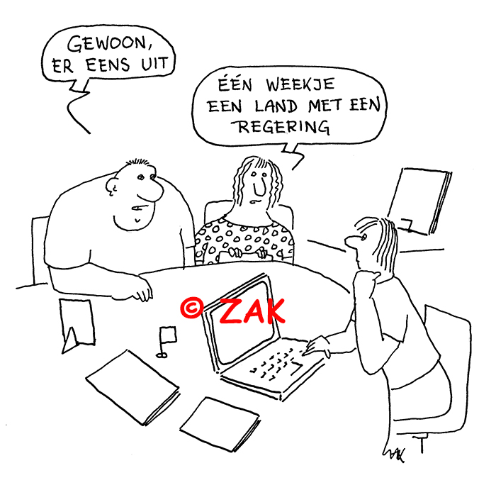 ZAK is de huistekenaar van De Morgen. Hij tekent ook in De Tijd, in Nederland in De Volkskrant en De Groene Amsterdammer, in Frankrijk in Le Point. Sinds 1997 publiceert ZAK bij Houtekiet/De Harmonie ieder jaar zijn Zakagenda. ZAK was in 1999 de eerste grote prijswinnaar van de PCB (toen nog PCP, Perscartoonprijs). In 2000 kreeg hij de Arkprijs van het Vrije Woord. In 2001 won hij in Nederland de Inktspotprijs van de stichting Pers & Prent. In 2003 won ZAK opnieuw de Grote PCB-Prijs en ook de eerste BeNe-prijs voor de beste cartoon uit de Belgische en de Nederlandse pers. In de PCB 2010 viel hem een eervolle vermelding te beurt. Hier krijgt u een selectie beelden voorgeschoteld uit De Morgen; een chronologische weegave van de stokkende regeringsonderhandelingen in cartoons.