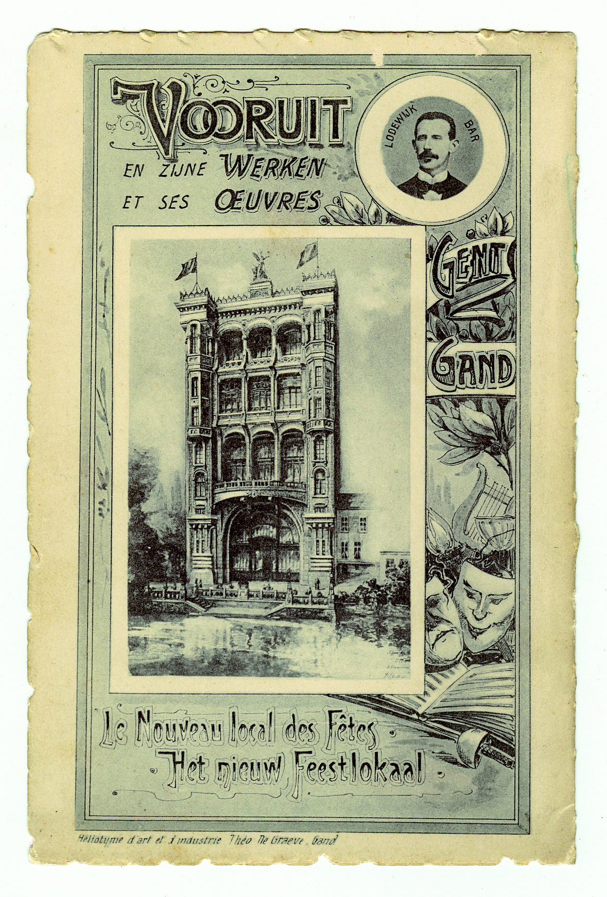 De in 1880 opgerichte socialistische coöperatie Vooruit bouwde in de decennia voor de Eerste Wereldoorlog in Gent een klein imperium uit van kruidenierswinkels, apotheken, volkshuizen en fabrieken. Met monumentale gebouwen als Ons Huis op de Vrijdagmarkt en het Feestlokaal van Vooruit in de Sint-Pietersnieuwstraat wilde de coöperatie het gevoel van eigenwaarde van de arbeiders opkrikken, maar ook haar tegenstanders wijzen op de machtspositie die de socialistische beweging in Gent had weten te verwerven. Vooruit liet geen gelegenheid onbenut om met haar patrimonium te pronken. Maquettes, brochures, prentbriefkaarten en foto’s moesten de eigendommen van Vooruit bij iedereen bekendmaken. Naar aanleiding van de Wereldtentoonstelling die in 1913 in Gent plaatsvond, bracht de coöperatie bijvoorbeeld deze reeks prentbriefkaarten uit die haar rijke patrimonium in beeld bracht. Meer info via Amsab-ISG of via Dr. Liesbet Nys (Universiteit Gent), curator van de tentoonstelling ‘100 jaar Vooruit’ in het Gentse stadsmuseum STAM en auteur van het boek Vooruit Gent 1913-2013.