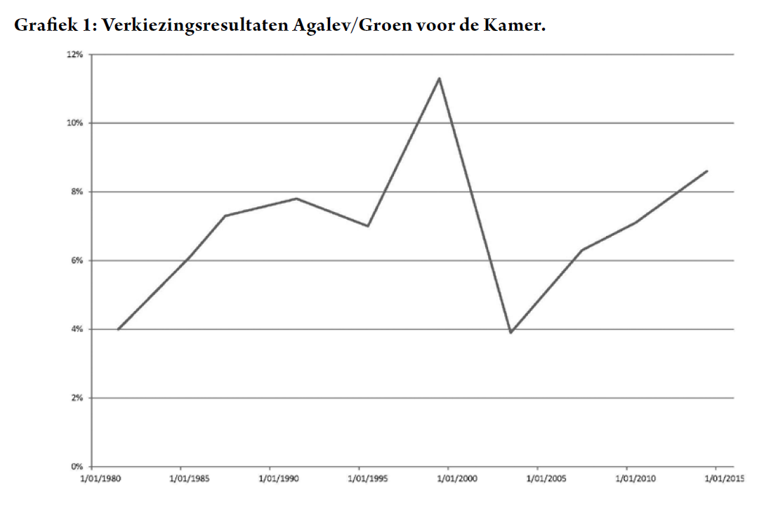 Grafiek 1, met de evolutie van de verkiezingsresultaten van de groenen voor de Kamer sinds 1981, plaatst hun zege bij de recentste verkiezingen in historisch perspectief. Na de eerste deelname aan de federale verkiezingen volgden nog negen verkiezingen, waarbij de groenen in zeven van de negen gevallen hun score ten opzicht van de voorgaande stembeurt verbeterden. Zo bezien is het electorale parcours van Groen er een van successen.