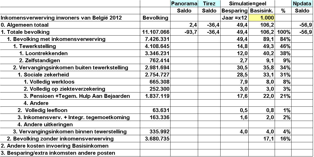 - Voor de vervangingsinkomenstrekkers is er 39,8 miljard euro nodig, waarbij enkel het vervangingsinkomen boven 1.000 euro behouden blijft en voor de anderen het aangevuld en vervangen wordt tot 1.000 euro. Voor de werkenden, loontrekkenden en zelfstandigen dient 49,3 miljard euro te worden voorzien, bijkomend aan de huidige wedde of inkomen. Ten slotte zou 17,1 miljard euro Basisinkomen uitbetaald worden aan wie nu geen inkomen verwerft, aan mensen die dus volledig buiten de systemen van inkomensverwerving staan (huismoeders zonder inkomen, renteniers, ouderen zonder pensioenrecht, enzovoort).