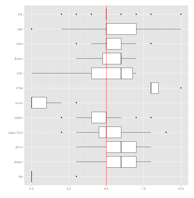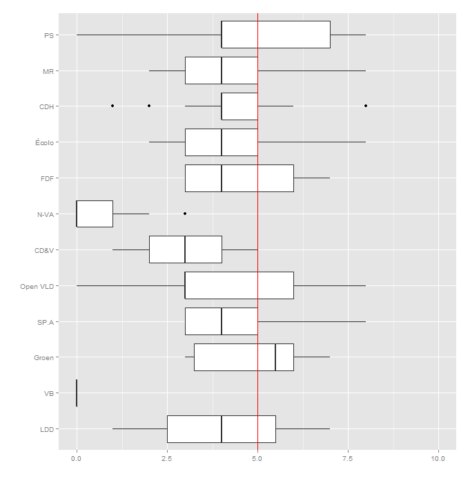 8/ De ‘snorrendozen’ zijn als volgt te begrijpen: de ‘snorrendoos’ vertegenwoordigt 50% van de antwoorden van de parlementsleden van de beschouwde partij, de zwarte verticale streep binnen de witte doos geeft de mediaan weer, de ruimtes links en rechts van de mediaan geven de waarden weer van 25% van de respondenten, en de uitersten van de zwarte horizontale strepen komen overeen met de minimale en maximale waarden. De punten geven dus de extreme waarden van de respondenten weer. Hoe meer de ‘snorrendoos’ is uitgestrekt, hoe meer de antwoorden van de parlementsleden zijn verspreid op de schaal van 0 tot 10 (en, dus, hoe zwakker de cohesie van de partij).