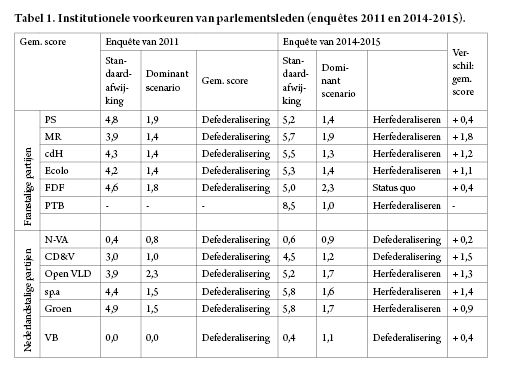 Uit een uitgebreid onderzoek bij de leden van alle parlementen in België blijkt hun voorkeur over de bevoegdheidsverdeling in België te zijn geëvolueerd. Terwijl in 2011 de gemiddelden van alle partijen nog uitkwamen op een (lichte) defederalisering van bevoegdheden zitten die van de Franstalige partijen, sp.a, Groen en Open VLD intussen op een (lichte) herfederalisering. Bovendien evolueerden alle partijen in Belgische richting. De kloof groeit tussen parlementsleden van N-VA/Vlaams Belang, die zo goed als geen België meer willen, en die van de andere partijen die iets minder of iets meer België willen. Dat een groeiend aantal parlementsleden open staat voor het terugbrengen van sommige bevoegdheden naar België verbreedt het spectrum van het debat over staatshervorming. Een vergelijking met de voorkeuren van de kiezers leert echter dat die nog een pak ‘Belgischer’ denken dan hun volksvertegenwoordigers.