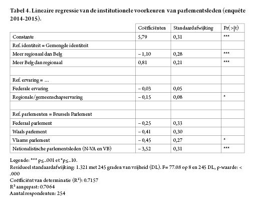 We betrekken vervolgens in de analyse van de verklarende factoren ook de individuele kenmerken van de parlementsleden. Daarvoor gebruiken we een multivariabel model met als afhankelijke variabele de scores van de parlementsleden op een schaal van 0 tot 10 (met andere woorden de institutionele voorkeuren die we pogen te verklaren). Gezien de aard van deze schaal, gebruiken we een lineaire regressie als statistisch model. We gebruiken de variabelen ‘parlementen’ en ‘nationalistische parlementsleden’, omdat er - zoals we net aantoonden - tussen beide variabelen substantiële verschillen bestaan. We voegen de variabele ‘politieke partij’ niet toe, aangezien de onderlinge scores van de partijen erg gelijk lopen (met uitzondering van N-VA en VB) en er binnen partijen verdeeldheid bestaat; dit zou de uiteindelijke kwaliteit van ons analysemodel verminderen.9