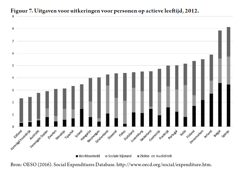 Wanneer we het totale aantal ontvangers van werkloosheid-, ziekte-, invaliditeit en sociale bijstandsuitkeringen onder de loep nemen, dan lijkt België maar weinig gemeen te hebben met het cliché van de uitkeringsstaat. Figuur 5 toont een optelsom van de drie stelsels die we hierboven bespraken, en dat leert ons dat in België relatief weinig personen op actieve leeftijd afhankelijk zijn van een uitkering. In de Verenigde Staten, Finland, Litouwen, Ierland, IJsland, Noorwegen en Duitsland deden minstens 1 op 5 van de actieven een beroep op een uitkering in 2012; in België was dat 1 op 7. Een laag aandeel actieven die een werkloosheidsuitkering ontvangen is dus geen garantie dat er minder mensen een beroep doen op uitkeringen, en bijgevolg geen garantie op minder overheidsuitgaven (zie verder). Dit toont aan hoe belangrijk het is om specifieke uitkeringsstelsels niet in isolement te bekijken.