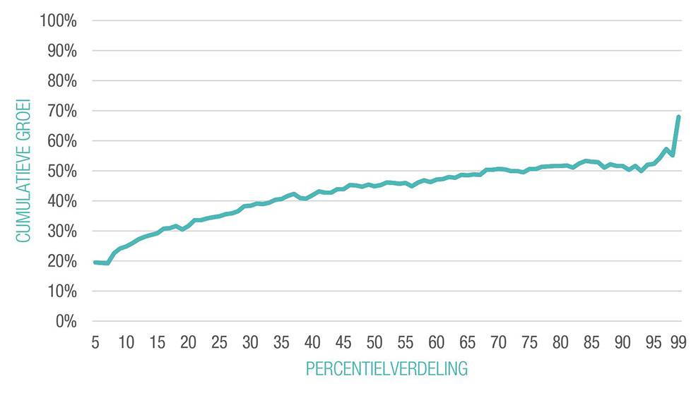 Ter verduidelijking: Figuur 1 toont de totale procentuele toename van de netto beschikbare gezinsinkomens van Belgische gezinnen. Dat is het inkomen dat mensen te besteden hebben, dus nadat belastingen zijn afgetrokken en eventuele uitkeringen zijn bijgeteld. Over zo'n lange tijdsspanne is de samenstelling van de gezinnen sterk veranderd. Daarom worden de netto beschikbare inkomens gecorrigeerd ('equivalent gemaakt') om de inkomens van gezinnen van verschillende grootte onderling en over de tijd heen vergelijkbaar te maken. De inkomens worden uitgedrukt in reële termen, dat wil zeggen dat er rekening wordt gehouden met de stijging van de levensduurte. In Figuur 1 worden de Belgen ingedeeld in percentielen: elk percentiel komt overeen met 1% van de Belgen, gerangschikt van de laagste naar de hoogste inkomens. De gegevens zijn afkomstig uit twee representatieve steekproeven waarin de inkomens van de deelnemers uitgebreid bevraagd worden, met name inkomens uit werk, huurinkomsten, uitkeringen et cetera. De eerste steekproef is het Sociaal Economisch Panel (SEP) die voor het eerst werd uitgevoerd in 1985, de tweede steekproef is de European Union Statistics on Income and Living Conditions (EU-SILC) survey waarvan ik hier de 2014 versie (met inkomensgegevens uit 2013) gebruik. Extreme waarden bij de hoogste en laagste inkomens werden gecorrigeerd, en Figuur 1 toont de resultaten van het 5e tot het 99e percentiel. Het is belangrijk op te merken dat vermogens (bijvoorbeeld bezit van vastgoed of aandelen) slecht worden geregistreerd in dit soort steekproeven. Het gaat dus om de besteedbare inkomens van mensen; de verdeling van de vermogens wordt besproken in het stuk van Sarah Kuypers in dit nummer.