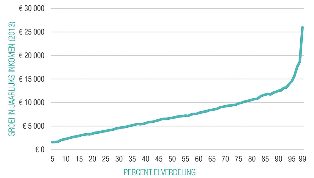Figuur 2 toont de toename van de inkomens voor de volledige inkomensverdeling in de voorbije 30 jaar in absolute waarde. Uitgedrukt in prijzen van 2013 hebben de laagste inkomensgroepen in de voorbije 30 jaar hun netto equivalent beschikbaar jaarinkomen met ongeveer €1.500 zien toenemen, de 5% rijksten met meer dan €15.000. Een relatieve ongelijke groei weerspiegelt zich dus in een sterke toename van de verschillen in levensstandaard. Als de laagste inkomens de toename in de levensstandaard van de midden- en hogere inkomensgroepen - en de daarbij horende veranderingen in consumptiepatronen en toegang tot diensten - niet (meer) kunnen volgen, wordt het voor hen moeilijker om een middenklasse bestaan te ambiëren. Relatieve inkomensverschillen die te groot worden remmen de sociale mobiliteit.