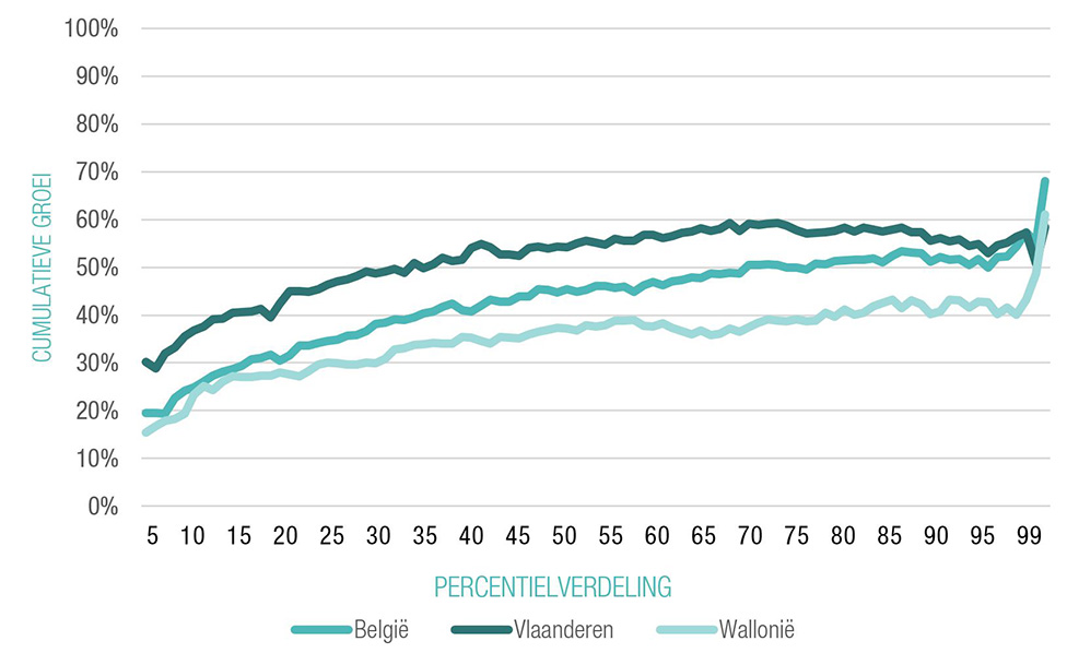 Figuur 3 toont de verdeling van de inkomensgroei in de periode 1985-2013 voor België, Wallonië en Vlaanderen. Voor Brussel zijn de gegevens niet betrouwbaar. Hoewel het groeipatroon in beide regio's grosso modo gelijkaardig verloopt, was de groei van de inkomens zowel sterker als gelijker in Vlaanderen dan in Wallonië. In Vlaanderen gingen de armsten er met 30% op vooruit, de ruime middenklasse zag het inkomen met 50 à 60% toenemen, en dat is evenveel als de groei aan de top. In Wallonië was de toename voor de armsten met 15 à 20% meer bescheiden, ging de middenklasse erop vooruit met 30 à 40%, en werd de ongelijkheid vooral groter aan de top. Het gevolg van deze ongelijke groei van de inkomens is dat de ongelijkheid tussen Vlaanderen en Wallonië groter is geworden over de tijd heen.