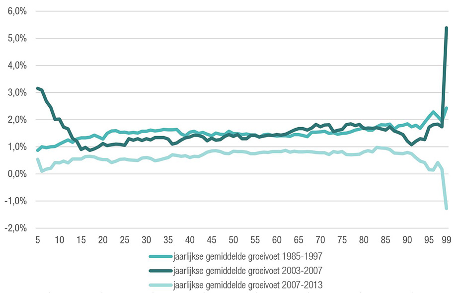 Figuur 4 toont duidelijke verschillen tussen de drie beschouwde periodes. In de periode tussen 1985 en 1997 groeiden de gezinsinkomens gemiddeld met 1,5% per jaar, net zoals in de periode tussen 2003 en 2007. Opvallend genoeg lijkt de verdeling van de inkomensgroei in de eerste helft van de jaren 2000 het spiegelbeeld van wat gebeurde in de jaren 1980 en 1990. Toen groeiden de gezinsinkomens van de hoogste inkomens ongeveer dubbel zo snel als de laagste inkomens (2% versus 1%). In de pre-crisisjaren 2003 tot 2007 gingen de laagste inkomensgroepen er het meest op vooruit (met uitzondering van de top 1%). Tijdens de crisisjaren en nadien zijn het weer de middengroepen die er het meest op vooruit gaan (met een jaarlijkse groei van ongeveer 0,8%), terwijl de groei stagneerde bij de laagste en de hoogste inkomens. Onder de oppervlakte van dertig jaar inkomensgroei schuilen dus verschillende en soms tegengestelde dynamieken.