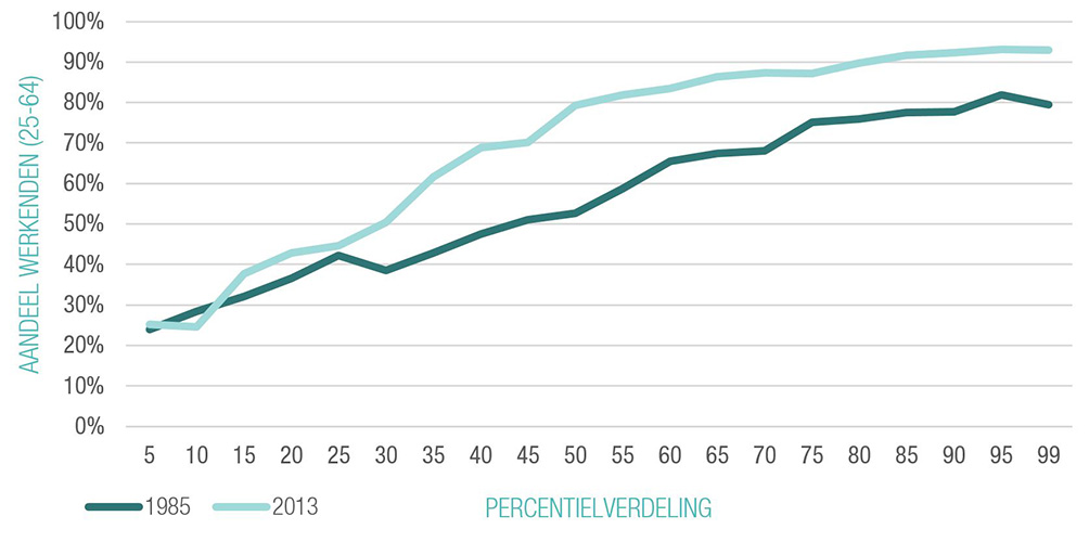 Figuur 5 toont de verandering van het aandeel personen dat een inkomen uit arbeid (in loondienst of zelfstandige arbeid) verwerft voor de volledige inkomensverdeling in de voorbije dertig jaar. De Belgische bevolking wordt ingedeeld op dezelfde manier als in de grafieken hierboven, maar deze grafiek toont de toename van het aandeel mensen tussen 24 en 64 jaar met een arbeidsinkomen ten opzichte van het totaal aantal 25 tot 64-jarigen in de groep. Figuur 5 toont zoals verwacht dat er meer mensen een inkomen uit arbeid verwerven aan de top van de inkomensverdeling dan aan de bodem. Belangrijk is echter dat de sterke toename van de tewerkstelling in de voorbije dertig jaar geconcentreerd was in het midden en aan de top van de verdeling, terwijl het aantal personen met een arbeidsinkomen bij de laagste inkomensgroepen niet is toegenomen. Dat strookt met eerdere studies die een polarisatie van de jobgroei aantoonden: de groei van de tewerkstelling is niet ten goede gekomen aan de gezinnen waar het minst wordt gewerkt.2