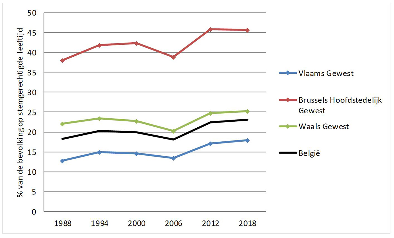 Figuur 2 geeft het aandeel volwassenen dat niet stemde bij de gemeenteraadsverkiezingen in de voorbije 30 jaar. Hier gaat het wel om het hoogste cijfer in de laatste 30 jaar, ook al is het stemrecht in de loop van de jaren uitgebreid (in 2000 naar de EU-burgers en in 2006 naar de niet-EU-burgers). De inschrijvingsgraad onder hen is immers laag, en het aantal niet-Belgen stijgt. Bovendien toonden we eerder aan dat er ten opzichte van de meeste jaren ook een stijgende niet-deelname is bij de ingeschreven kiezers. De enige uitzondering op de figuur is het Brussels Hoofdstedelijk Gewest, waar de niet-deelname (net) iets lager ligt dan bij de vorige verkiezingen, omdat het aandeel inschrijvingen onder de niet-Belgen er beduidend hoger was dan in de voorgaande jaren, en er relatief ook de grootste stijging was van de participatie onder de ingeschreven kiezers.