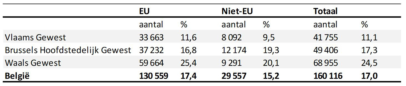 - In absolute termen daalde het aantal inschrijvingen voor EU-burgers wel licht in Wallonië, zowel in 2012 als in 2018, maar de stijging van de niet-EU-burgers was er groter. In relatieve termen was er in 2012 een algemene daling in alle gewesten, zowel voor EU-burgers als niet-EU-burgers. Die zet zich in 2018 door in Vlaanderen, maar dus niet in Brussel en slechts gedeeltelijk in Wallonië, waar het cijfer voor de niet-EU-burgers nu hoger ligt dan in 2012, maar lager dan in 2006. Hetzelfde geldt voor heel België.