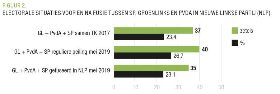 In de tweede plaats: een fusie kan electoraal lucratief zijn. Uit onderzoek dat ik deed bij I&O Research blijkt dat een fusie tussen GroenLinks en PvdA meer stemmen zou kunnen opleveren dan de partijen apart samen kunnen halen.11 80 tot 90% van de GroenLinks- en PvdA-kiezers zou op een fusiepartij van GroenLinks en PvdA willen stemmen, maar ook een kwart van de huidige D66- en SP-stemmers zou overstappen. Waar GroenLinks en PvdA in de peilingen nu tussen de 25 en 30 zetels halen, zouden ze er als gefuseerde partij tussen de 35 en 40 kunnen halen (Figuur 1). Met SP erbij zou de grotere fusiepartij (van GroenLinks, PvdA én SP) er minder halen dan een fusiepartij van GroenLinks en PvdA: veel GroenLinks- en D66-kiezers haken dan af (Figuur 2).