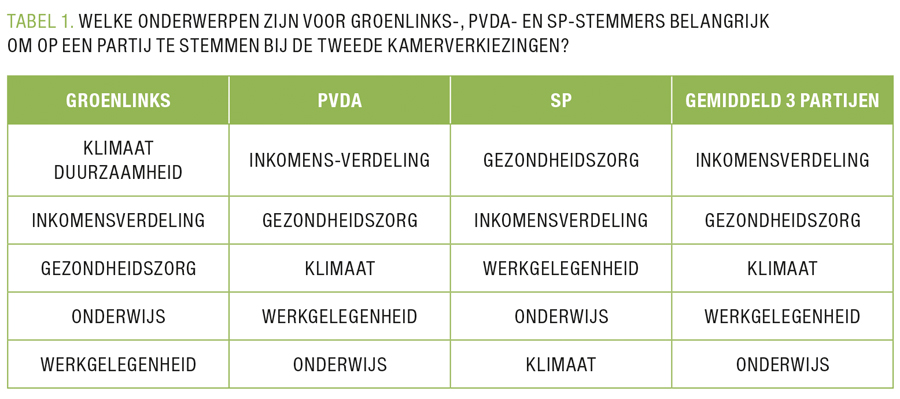 Voor GroenLinks-, PvdA- en SP-kiezers zijn in feite dezelfde vijf thema's redenen om op (een van) deze partijen te stemmen bij Parlementsverkiezingen: inkomensverdeling, zorg, klimaat, werkgelegenheid, onderwijs, maar in een verschillende volgorde van belang ( Tabel 1 ). Op het eerste gezicht lijkt het erop dat kiezers hun keuze vooral bepalen op basis van sociaaleconomische thema's. Immigratie, vluchtelingen, de dreiging van terrorisme of veiligheid, worden door PvdA-, GroenLinks- en SP-kiezers minder dan gemiddeld naar voren gebracht als onderwerpen die speelden bij het bepalen van een stem.