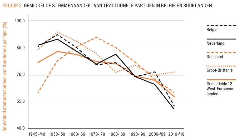 Uit Figuur 2 blijkt ook dat de daling in België niet geleidelijk aan plaatsvond, maar zich vooral de laatste jaren sterk doorzette. Gedurende de periode 1970 tot en met 2009 daalt het gemiddelde licht, maar blijft wel iets boven de 70% schommelen. Opmerkelijk is ook het opwaartse stemmenaandeel tijdens de periode 2000-2009, wat waarschijnlijk te maken heeft met de strategische campagnekeuzes van de traditionele partijen. In 2003 was dit de blokvorming van de sociaaldemocraten (en het kartel met Spirit) en liberalen tegen de ecologische partijen, in 2007 de kartelvorming van CD&V met N-VA. Hiertegenover brachten de vervroegde verkiezingen van 2010 rond 'Brussel-Halle-Vilvoorde' verliezen voor alle traditionele partijen, behalve PS. Bij de laatste verkiezingen van mei 2019 daalt het stemmenaandeel van de traditionele partijen met 11,6 procentpunten, ten voordele van Vlaams Belang en PVDA-PTB. Het is dus vooral deze recente daling die de lage positie van het Belgische gemiddelde ten opzichte van andere West-Europese landen verklaart.