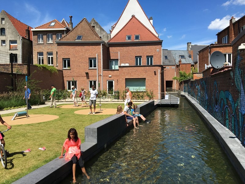 Een groener en trager straatbeeld zal de aantrekkingskracht van de stad verder versterken. Voor de heraanleg van de publieke ruimte wordt best maximaal ingezet op ontharding en groene zones met waterpartijen. Lokale besturen kunnen in samenspraak met de burgers een selectie van straten maken waar doorgaand verkeer nodig is en de overige straten doodlopend maken of inrichten als woonerven, zodat deze beschikbaar worden voor de bewoners en spelende kinderen. Dit creëert extra ontspanningsruimte en ontlast de drukke parken en pleinen. Door de straten te voorzien van divers begroeide groenstroken en waterpartijen zal men dagelijks in contact te komen met stadsgroen en groeiende biodiversiteit. Dit zal de mentale gezondheid ten goede komen en de lagere luchtvervuiling zal de vatbaarheid voor ziekten tegengaan. Als we de publieke ruimte als onze voortuin kunnen inrichten met een extra bankje op de hoek van de straat, geveltuinen, wadi's, groenslingers en moestuinen in het straatbeeld, zullen mensen vaker buiten in elkaars gezelschap vertoeven. Een publiek-private gradiënt kan worden aangebracht in reeds bestaande groenzones zoals bijvoorbeeld individuele tuinen ingesloten in woonblokken. Deze kunnen transformeren naar één grote gegroepeerde semipublieke tuin, die verbindend werkt en ook de bewoners van het hoekhuis zonder buitenruimte de kans geven om van de zonnestralen en natuur te genieten. Dit lijkt wishful thinking, maar vandaag bestaan er reeds meerdere voorbeelden die het succes en de meerwaarde van anders samenwonen aantoont. Geef de enthousiaste bewoners van dergelijke projecten een ambassadeursrol om de mind shift bij de Vlaming in gang zetten.