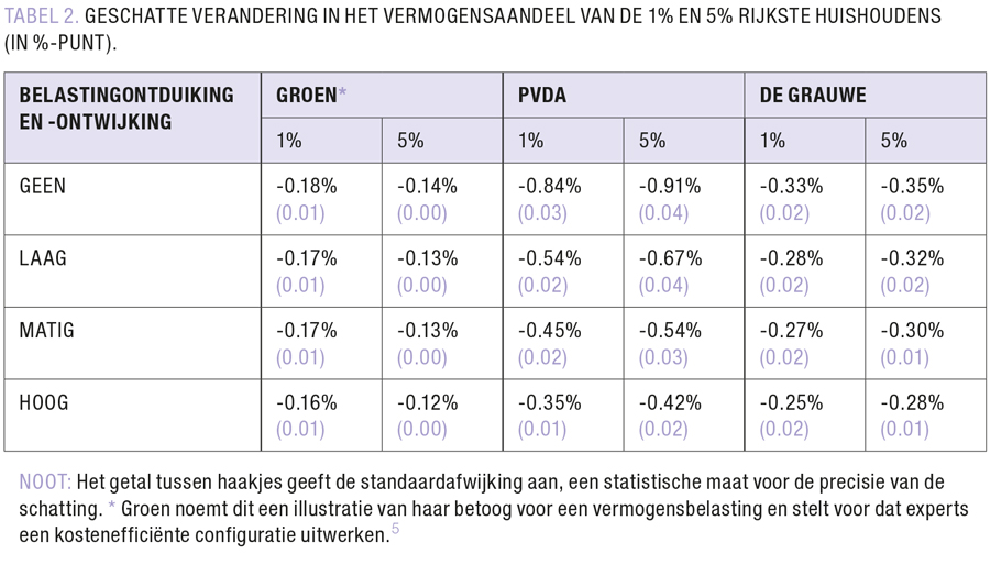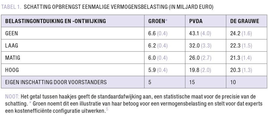 Door de belastingconfiguraties van PVDA, De Grauwe en Groen te koppelen aan de geschatte Belgische vermogensverdeling en de inkrimping van de belastbare basis in rekening te brengen, kan de potentiële opbrengst benaderd worden. Wat blijkt? De geschatte opbrengst ligt een stuk hoger dan de eigen inschatting van deze drie voorstanders van een vermogensbelasting,7 zelfs onder conservatieve assumpties rond belastingontduiking en -ontwijking (TABEL 1).