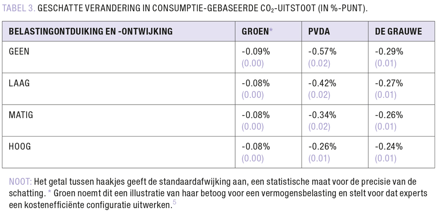 Empirisch onderzoek rond de theoretische verwachting dat ongelijkere samenlevingen ook minder duurzaam zijn, is schaars. De enige studie die vermogensongelijkheid linkt aan klimaatimpact bevestigt dat ongelijkere samenlevingen het op klimaatvlak slechter doen.8 Door de resultaten van deze studie te combineren met de geschatte verandering in het vermogensaandeel van de rijkste huishoudens kan de klimaatimpact van een eenmalige vermogensbelasting benaderd worden. Wat blijkt? De klimaatimpact van elk van de drie voorstellen is positief maar klein (TABEL 3), wat niet verrassend is gezien hun beperkte herverdelende werking.