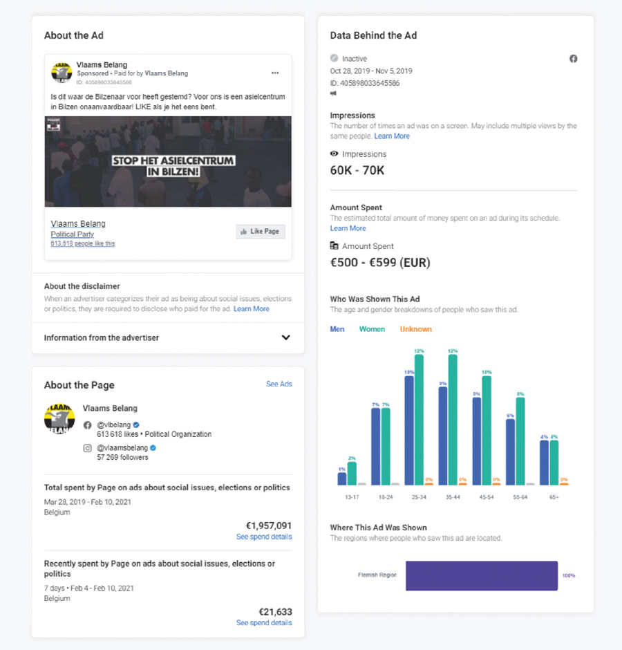 Zo goed als alle partijen hebben zich deze logica eigen gemaakt, volledig op maat van Facebooks verdienmodel: enerzijds brede, vaak onschuldige content voor mensen die weinig tot niets met de partij te maken hebben, anderzijds specifieke oproepen voor militanten om bijvoorbeeld actie te ondernemen tegen een asielcentrum. Zo liep een week voor de brandstichting in het asielcentrum van Bilzen deze advertentie (ZIE HIERONDER) van Vlaams Belang op de partijkanalen. De hoofdverdachte blijkt de voorzitter van de lokale Voorpost-afdeling te zijn, die in september nog het nieuws haalde met zijn deelname aan de Vlaams Belang autokaravaan, met een pick-uptruck vol nazisymbolen. Uiteraard heeft een partij er vervolgens niets mee te maken als een militant van die partij plots brand gaat stichten.