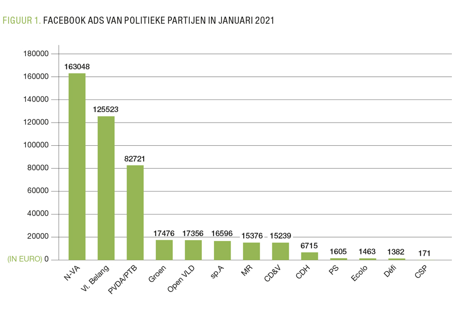 In augustus 2019 kopte Het Laatste Nieuws dat Vlaams Belang de verkiezingen had gewonnen dankzij Facebook. De partij kondigde toen aan om 100.000 euro per maand te investeren in Facebook ads, en niet langer in traditionele huis-aan-huis bladen en folders. Een half jaar later volgde PVDA met vergelijkbare investeringen en in 2020 verhoogde N-VA haar budget voor sociale media gevoelig, waardoor vandaag drie partijen meer dan 80.000 euro per maand investeren in Facebook ads (FIGUUR 1). De hoogte van die budgetten is, ook in de Belgische reclamewereld, enorm: er zijn héél weinig bedrijven die meer dan een miljoen euro per jaar op tafel leggen voor reclame. En in tegenstelling tot flyers of affiches, gaat het om gepersonaliseerde berichten die, alles tezamen, honderdduizenden mensen bereiken.