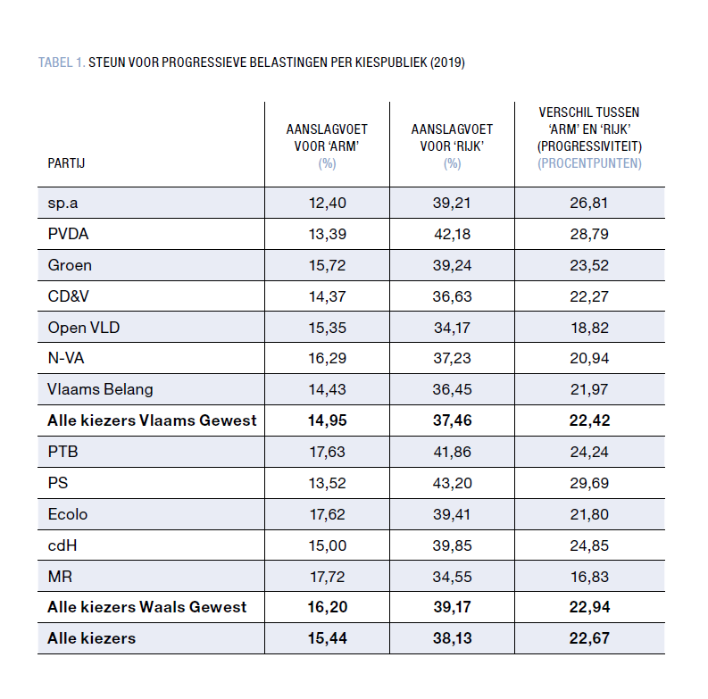 Het merendeel van de Belgen is groot voorstander van een progressief belastingstelsel. Zelfs burgers met een hoog inkomen steunen progressieve belastingen, althans bij diegenen die voldoende politieke kennis en interesse hebben.
