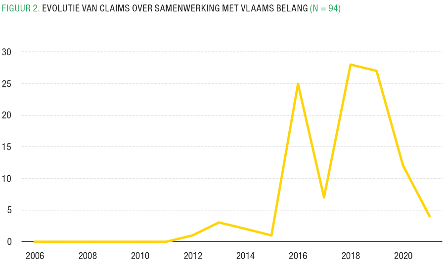 De evolutie over de tijd leidt tot twee belangrijke vaststellingen (FIGUUR 2). Ten eerste wordt duidelijk dat deze claims vooral worden gemaakt in verkiezingsperiodes, tijdens de campagne of vlak na de verkiezingen wanneer onderhandelingen worden aangevat. Ten tweede, is er een algemene stijgende trend, waarbij sinds 2016 de Vlaamse partijen meer aandacht besteden aan regeren met Vlaams Belang. Voor een deel is dit wellicht een functie van het toenemende gebruik van Twitter als communicatiekanaal. Daarnaast gaat deze vaststelling hand in hand met stijgend succes voor Vlaams Belang in de peilingen en de lokale verkiezingen van 2018 en de verkiezingen van 2019. In 2014 behaalde Vlaams Belang één van de slechtste verkiezingsresultaten ooit, maar sindsdien is het opnieuw aan een electorale opmars bezig.