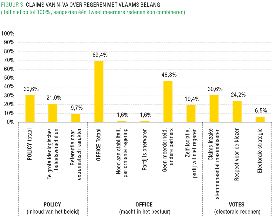 De positie van N-VA over regeren met Vlaams Belang is veel ambivalenter en complexer dan de andere Vlaamse partijen. Zo verwijst N-VA in de communicatie vaker naar het feit dat ze tegen een cordon sanitaire zijn (en tegen principiële uitsluiting van Vlaams Belang van de macht), wat een duidelijk verschil is met de andere Vlaamse partijen die het cordon niet in vraag stellen (FIGUUR 3). In het algemeen zijn er vier belangrijke argumentatielijnen die N-VA gebruikt. De positie van N-VA is consistent doorheen de tijd en de formulering van de claims zeer specifiek. Dat lijkt erop te wijzen dat het de specifieke toepassing is van een uitgekiende strategie waarbij voorzichtig de woorden worden gewikt en gewogen. N-VA gebruikt bij voorkeur argumenten gelinkt aan macht (office), gevolgd door claims over beleid/inhoud (policy) en claims gelinkt aan stemmenaantal (vote).