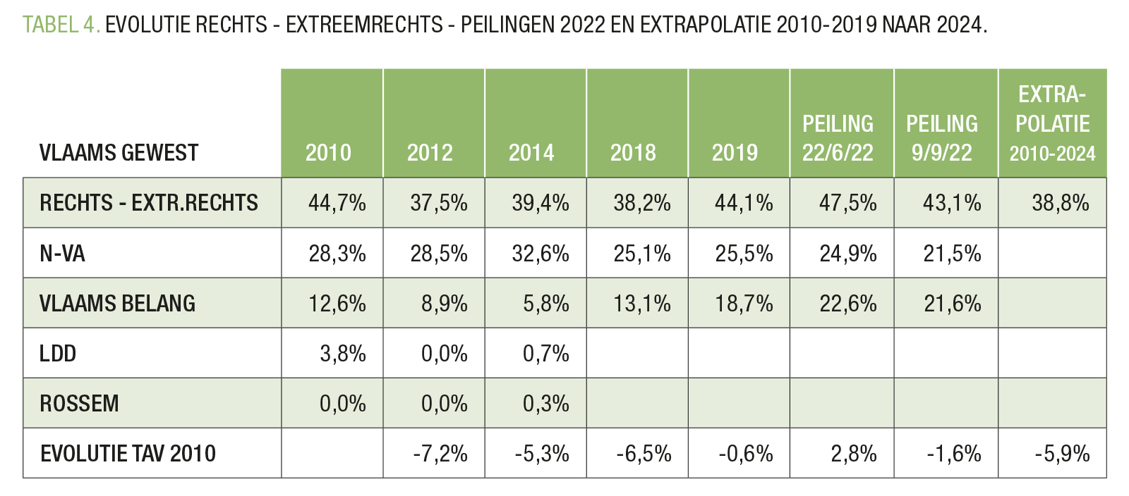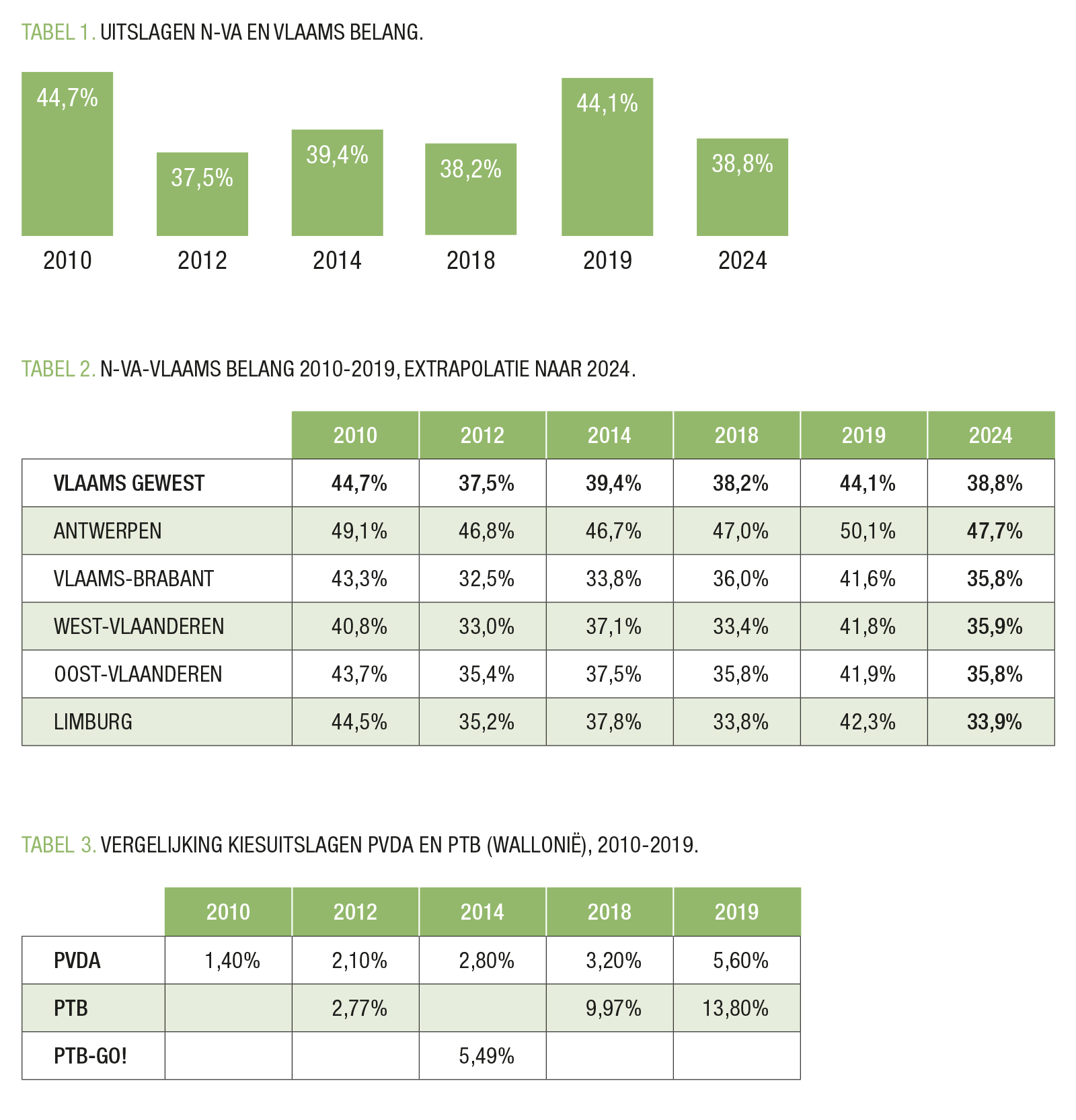 De groei van Vlaams Belang in 2019 was echter in feite een anomalie, een 'accident de parcours' in de neergang die haar na 2010 steil bergaf deed gaan naar 5,8% in 2014, waar ze als communicerend vat dienst deed voor N-VA. Gaat N-VA-Vlaams Belang verder in neergaande zin ten aanzien van 2010? En komt, in dat scenario, de mogelijkheid open voor een onuitgegeven linkse coalitie van Vooruit, PVDA, Groen en CD&V als Vlaamse regering in 2024, voortgaande op 61,2% niet-N-VA- en niet-Vlaams Belangstemmen ( TABEL 1 )?