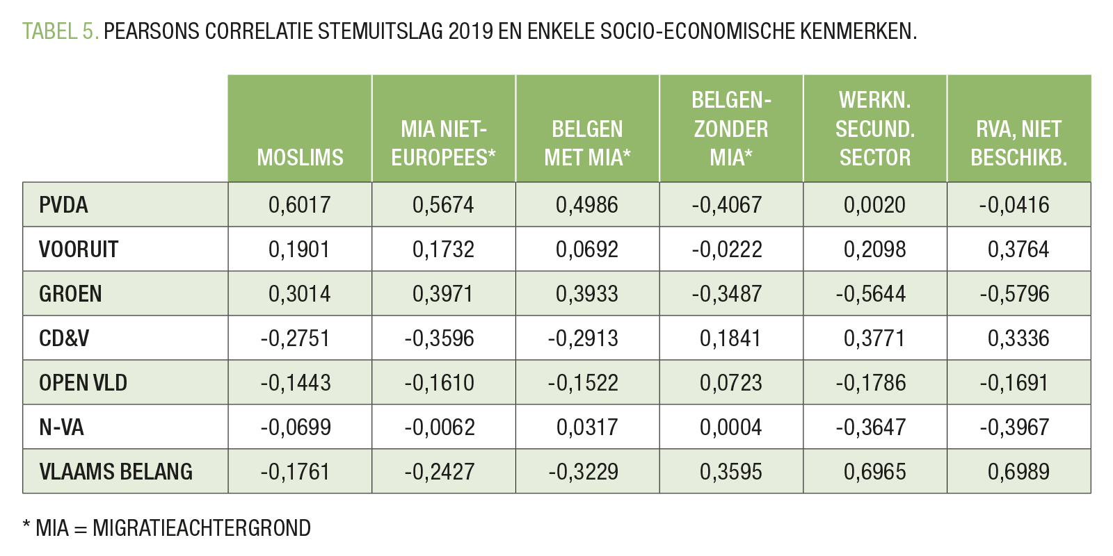 De sterkste correlatie die in TABEL 5 wordt vastgesteld, is deze van het percentage van de 18-64-jarigen die een RVA-uitkering genieten zonder beschikbaar te zijn om te werken – diegenen die Vlaams Belang nog al eens vlug de 'profiteurs' van de sociale zekerheid noemt en daarmee de inwoners met migratieachtergrond bedoelt (die, in tegenstelling tot wat rechts en extreemrechts denken, wél beschikbaar zijn voor de arbeidsmarkt). Ook gemeenten met een hoog percentage werkend in industriële sectoren, bouw en energie matchen met een stem voor Vlaams Belang. Arbeidersgemeenten tonen geen verband met een stem voor PVDA. In gemeenten met een hoger percentage moslims wordt wel in meerdere mate voor PVDA gestemd. In dezelfde lijn correleert stemmen voor PVDA met een hoger percentage inwoners met niet-Europese migratieachtergrond en Belg geworden vreemdelingen. Groen matcht niet met arbeiders; ze moet het hebben van hoger opgeleiden en bedienden uit de tertiaire sector. N-VA is de partij met het meest verschillende publiek, zonder verband met Belgen met Belgische achtergrond (die wel sterker terug te vinden zijn bij Vlaams Belang). Gemeenten waar meer dan elders Italianen wonen, scoren lager voor Vlaams Belang. En CD&V heeft een lager kiesresultaat in gemeenten met inwoners uit zwart-Afrika.