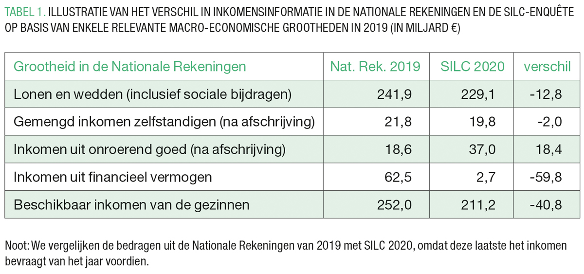 In de DINA-benadering wordt het volledige netto nationaal inkomen verdeeld. Als we op basis van de methodologie van de Nationale Rekeningen een proxy-'Netto Nationaal Inkomen' construeren met de in SILC aanwezige info, dan bekomen we een totaal van 288,7 miljard, in plaats van het macro-economische aggregaat van 393,3 miljard. We 'missen' dus meer dan 100 miljard €. Zelfs in termen van het beschikbaar inkomen van de gezinnen blijft de kloof aanzienlijk: 211,2 miljard in SILC tegenover 252 miljard in de Nationale Rekeningen (laatste rij in TABEL 1).