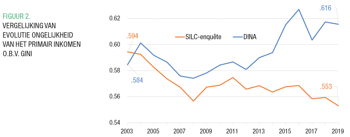 Zeker vanaf 2013 wordt het verschil tussen ongelijkheid gemeten in SILC en gemeten met de DINA-aanpak nog uitgesprokener dan in FIGUUR 1. Dat is deels omdat ook in SILC de daling van de ongelijkheid in het primair inkomen sterker is dan de daling van de ongelijkheid in het beschikbaar inkomen. Maar het blijft opvallend dat de evolutie in ongelijkheid in primair inkomen wél min of meer parallel verloopt tot ongeveer 2012 (met een daling van de ongelijkheid tot aan de financiële crisis van 2008 en een toename 2008-2001), maar dat de twee curven heel sterk uit elkaar lopen vanaf 2013.