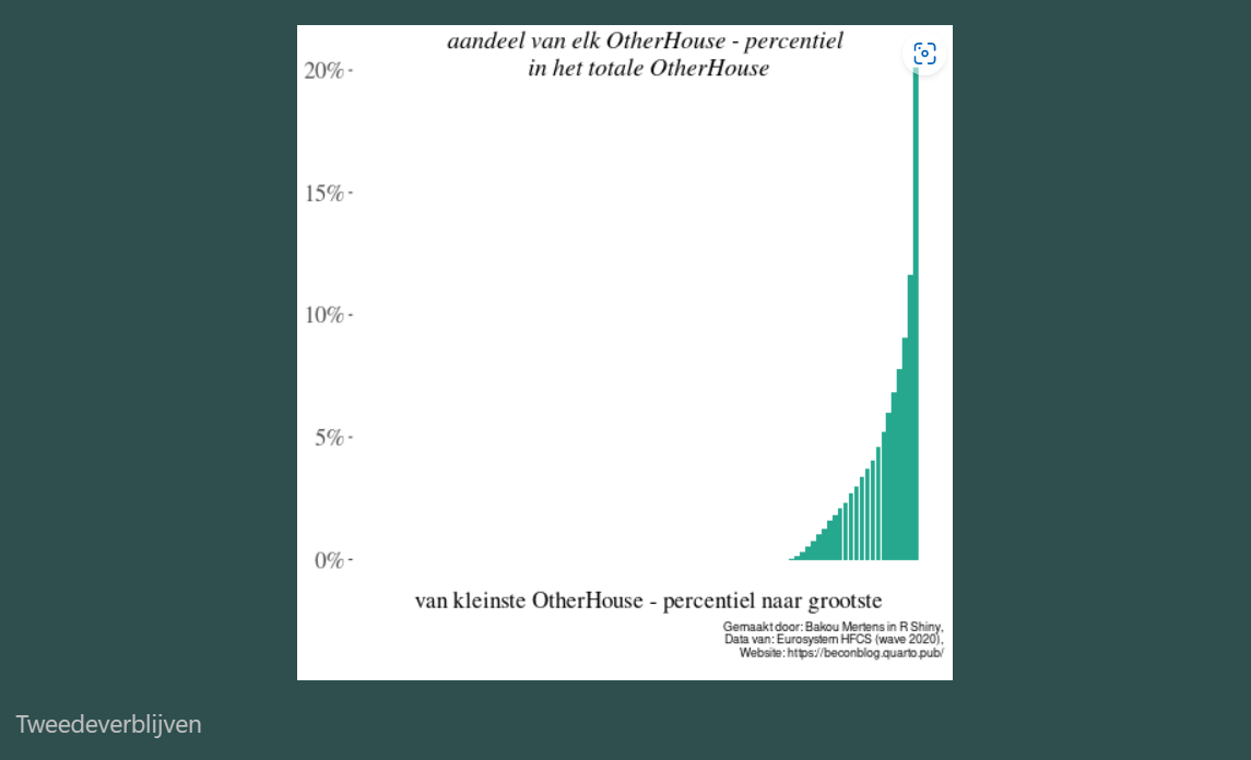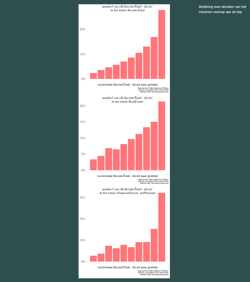 Om dit zelf te achterhalen moet je de variabele op de x-as constant houden, wat betekent dat je de bevolking verdeeld over hokjes (decielen of percentielen) op basis van één welbepaalde variabele, bijvoorbeeld het totale inkomen Wanneer je vervolgens de verdeling van totaal vermogen uiteenzet, kan je nagaan of de functie stijgend verloopt. Zo ja, dan wil dat zeggen dat huishoudens met meer inkomen (meer naar rechts op de x-as) ook een hoger aandeel van het Belgische vermogen bezitten. Dat blijkt inderdaad het geval te zijn.
