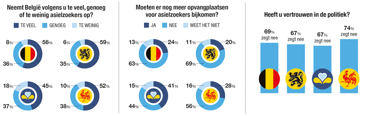 Men zou kunnen denken dat onder invloed van extreemrechts in Vlaanderen en (radicaal-)links in Wallonië de twee publieke opinies er uiteenlopende meningen over asiel en migratie op nahouden. Uit De Grote Stemming – de driemaandelijkse opiniepeiling van Het Laatste Nieuws, VTM, RTL en Le Soir – van april 2023 blijkt dat dit niet het geval is.7 Zoals Het Laatste Nieuws het samenvat: ‘Vlamingen die hard en streng zijn voor asielzoekers en Walen die een zachte, humane aanpak prediken? Dat beeld klopt niet. Een meerderheid van zowel Vlamingen als Walen vindt dat het asielbeleid van de regering-De Croo een pak strenger mag.’ Op de vraag of er nog meer opvangplaatsen voor asielzoekers moeten bijkomen, antwoordt 20% van de ondervraagde Vlamingen ‘ja’ en 69% ‘neen’. Aan Waalse kant antwoordt 28% ‘ja’ en 56% ‘neen’. Het is in Brussel dat de antwoorden het meest positief zijn (41% ja, 44% neen), maar dat is ook de plek waar het probleem het meest schrijnend is. 59% van de Vlamingen en 52% van de Walen zeggen dat België al te veel asielzoekers opvangt. Dit cijfer is het laagst in Brussel: 44%.