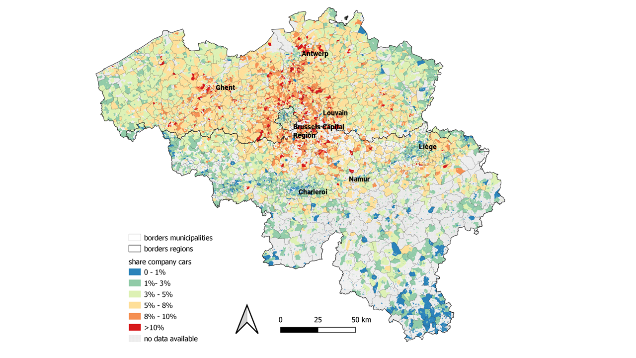 De hoogste inkomensdecielen zijn buitenproportioneel vertegenwoordigd onder de begunstigden van een salariswagen. De begunstigden van bedrijfswagens wonen niet in perifere autoafhankelijke locaties waar er geen treinen rijden. Integendeel, ze zijn oververtegenwoordigd in de Vlaamse economische ruit en Waals-Brabant (zie FIGUUR hieronder). Niet toevallig de rijkste regio’s van het land, met degelijk openbaar vervoer. In de armste wijken van Brussel is het met een vergrootglas zoeken naar salariswagens, terwijl Brussel er wel dagelijks door wordt overspoeld.