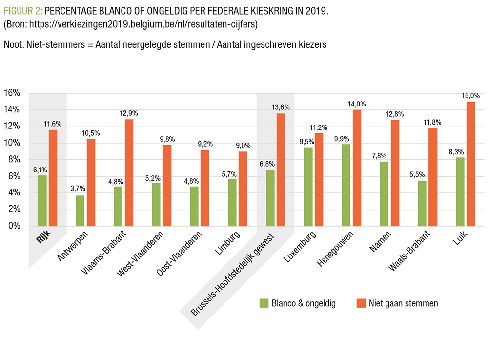 Opmerkelijk is echter het groeiende aantal kiezers dat helemaal niet gaat stemmen. Hoewel in België een opkomstplicht geldt, zijn de afgelopen tien jaar meer dan één op tien kiezers niet komen opdagen tijdens de stembusgang, met een record van 11,6% in 2019. Tellen we daar de 6,1% blanco en ongeldige stemmen bij, dan blijkt dat in België één op zes kiezers geen stem uitbrengt voor een politieke partij. Ook hier zien we verschillen tussen de kieskringen, waarbij het percentage niet-stemmers in Wallonië anno 2019 opnieuw aanzienlijk hoger ligt dan in Vlaanderen. De provincies Luik en Henegouwen kunnen de minste kiezers mobiliseren om naar de stembus te trekken; Antwerpen en Vlaams-Brabant tenderen in Waalse richting; Limburg en Oost-Vlaanderen blijken dan weer het meest succesvol in het mobiliseren van kiezers, maar ook daar brengt ongeveer 15% geen geldige stem uit.