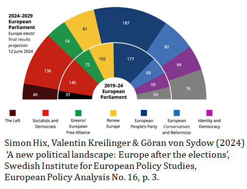 Zeker omdat tegelijkertijd delegaties binnen de EVP naar rechts zijn opgeschoven, zal het zwaartepunt van het nieuwe Parlement veel conservatiever komen te liggen. Toch moeten linkse partijen niet wanhopen, zoals ik voor de verkiezingen al schreef in Samenleving & Politiek. De huidige en zeer waarschijnlijk ook volgende voorzitter van de Europese Commissie Ursula Von der Leyen, die voor de verkiezingen nog de hand reikte naar de ECR van de Italiaanse premier Meloni, heeft ondertussen aangegeven niet structureel met extreemrechts te zullen samenwerken. Zij beseft goed dat ze om goedgekeurd te worden door het Parlement en nadien beleid te kunnen voeren de steun van liberalen en sociaaldemocraten nodig heeft. Wellicht zullen ook de groenen die coalitie versterken zodat de nieuwe Commissie op een voldoende solide meerderheid gestoeld is, zodat wetgeving ook goedgekeurd kan worden als een deel van de parlementsleden de positie van de Europese groep niet volgt.
