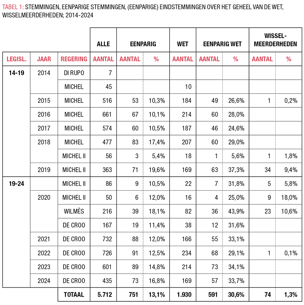 TABEL 1 toont immers dat het procentuele aandeel eenparige stemmingen – dus zonder enige afwijkende stem – van 2014 tot 2024 zelfs licht is gestegen. Nu is het aantal eenparig stemmingen op het geheel van de stemmingen geen bijster goede indicator: de meeste stemmingen zijn ‘uitgelokte’ stemmingen, bijvoorbeeld door het indienen van amendementen. Het zou vreemd zijn mochten deze tot een eenparig resultaat leiden. De beste steekproef is de eindstemming over het geheel van de wet: in dergelijk geval verplicht de Grondwet tot een naamstemming, consensus of niet. Ongeveer 30% van de eindstemmingen over het geheel van de wet blijken eenparig en dat percentage lag zelfs lichtjes hoger tijdens de regering-De Croo.7