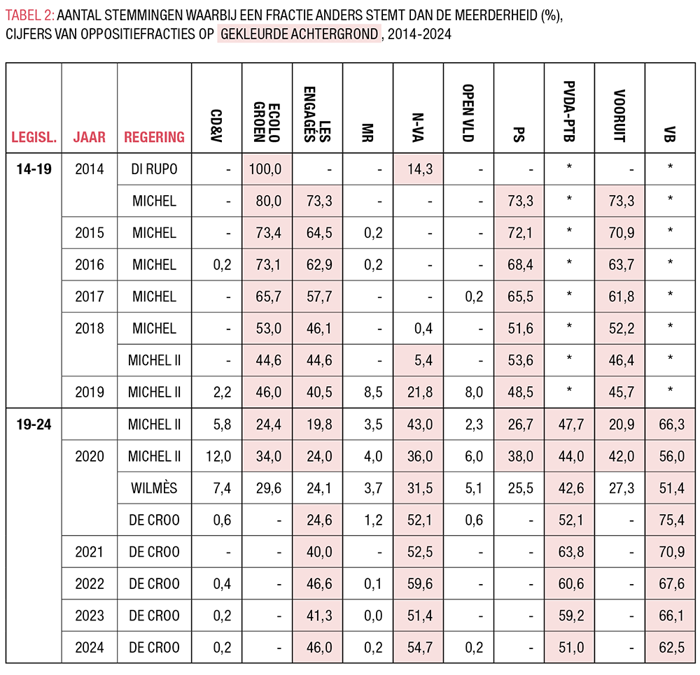 In de praktijk gebeurt dit meestal in verspreide slagorde. Geen enkele oppositiefractie stemt 90% van de tijd tegen de meerderheid. Procentueel gezien leunt N-VA bijvoorbeeld dichter bij de Vivaldi-meerderheid aan dan de socialistische fracties dat deden met de Zweedse regering (2014-2018). De percentages verschillen dag en nacht naargelang men deel uitmaakt van de meerderheid: ook de meest ‘gematigde’ van de oppositiefracties – Les Engagés – stemt in ongeveer 40% van de gevallen anders dan de meerderheid.