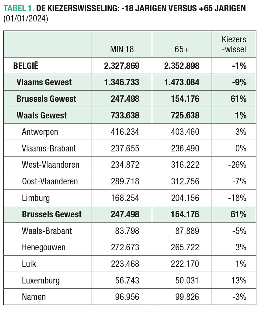 De 2,3 miljoen -18 jarigen zijn even groot in aantal als alle +65 jarigen. Binnen 18 jaar zullen zij de huidige +65 jarigen als kiezers hebben vervangen. In elk gewest, provincie en vooral in elke gemeente zijn deze aantallen verschillend. ‘De kiezerswisseling’ is een maatstaf voor deze demografische dynamiek. De formule (aantal -18 jarigen – aantal +65 jarigen = de kiezerswisseling) geeft de maatstaf die mee de toekomst van partijen zal bepalen. Dat bleek ook al uit de correlatie van de kiesuitslag van 9 juni met de nieuwe kiezers (18-23 jaar). Als de kiezerswisseling positief is, is er een grotere instroom van jonge kiezers. Bij negatief resultaat is het aantal -18 jarigen dat instroomt lager dan de uitstroom (TABEL1).