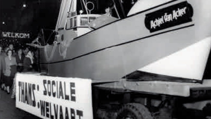 De motorsloep ‘Achiel Van Acker’ als metafoor voor zijn realisaties: het verleden als oude sloep, het heden als moderne motortrawler, die de sociale welvaart voorstelt (ongedateerd). ©Amsab-ISG, Gent