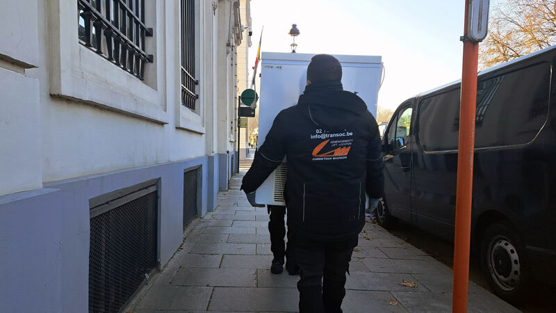 Nadat de Belgische staat de opgelegde dwangsommen bleef negeren, nam een deurwaarder een diepvriezer en koffiemachine in beslag uit Nicole De Moors kabinet, © VRT NWS