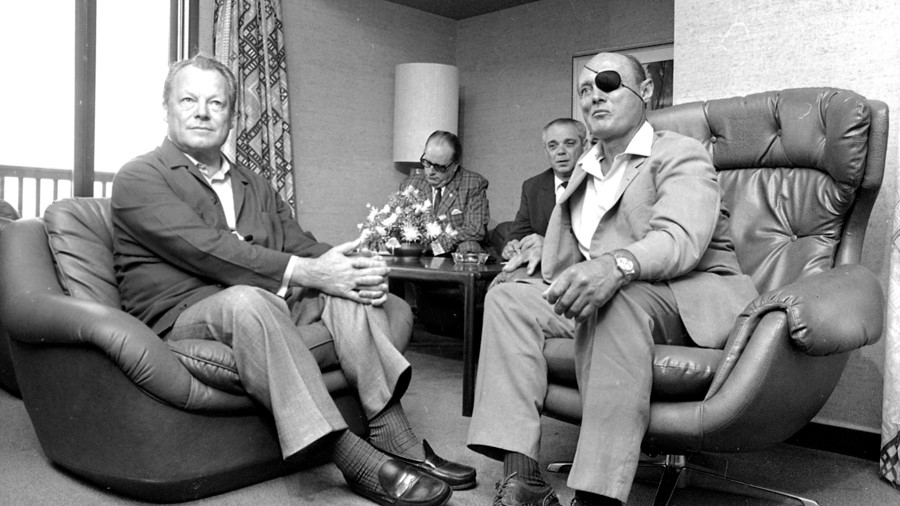 Kanselier Willy Brandt met de Israëlische defensieminister Moshe Dayan in Tel Aviv, juni 1973 © Wikimedia Commons